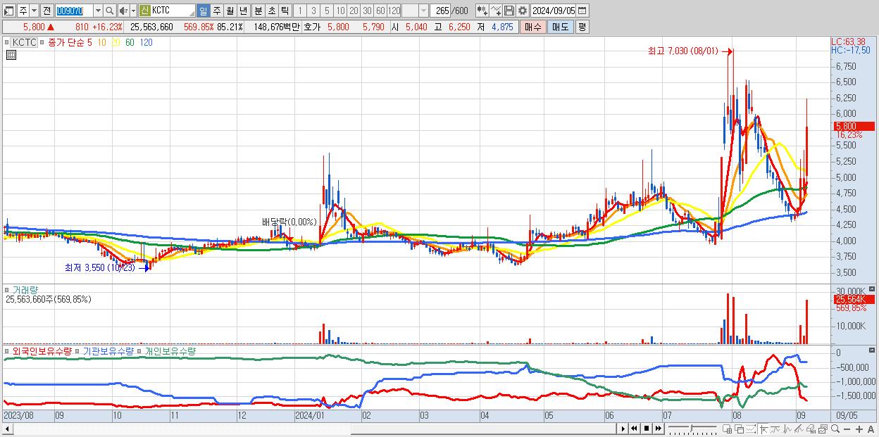 - KCTC (5,800원 ▲ 16.23% , 시총: 1,740억, 거래량: 25,563,660, 거래대금:1,487억)