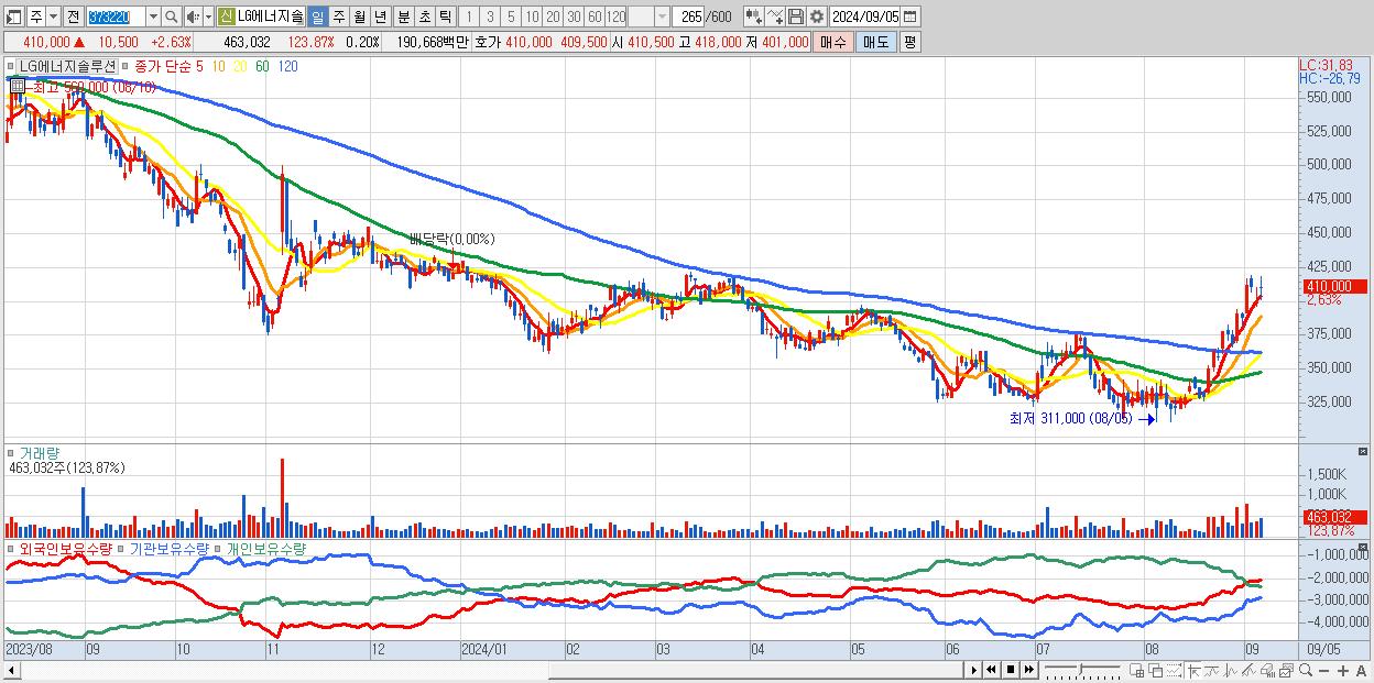 - LG에너지솔루션 (410,000원 ▲ 2.63% , 시총: 959,400억, 거래량: 463,032, 거래대금:1,907억)