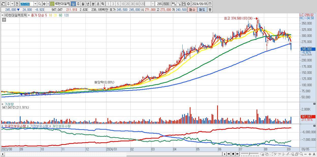 - HD현대일렉트릭 (245,000원 ▼ -8.92% , 시총: 88,315억, 거래량: 947,047, 거래대금:2,382억)