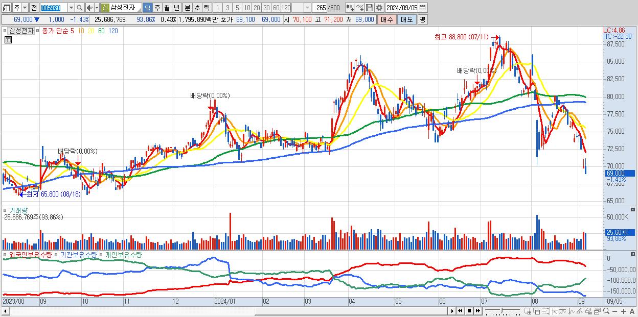 1.삼성전자 69,000원 ▼ -1.43% (KOSPI, 005930)