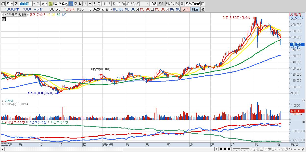 - HD한국조선해양 (168,000원 ▼ -4.44% , 시총: 118,899억, 거래량: 600,045, 거래대금:1,016억)
