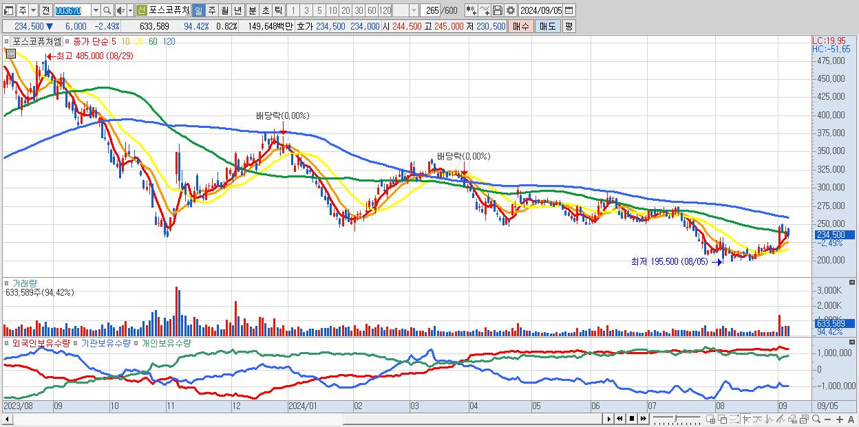- 포스코퓨처엠 (234,500원 ▼ -2.49% , 시총: 181,651억, 거래량: 633,589, 거래대금:1,496억)