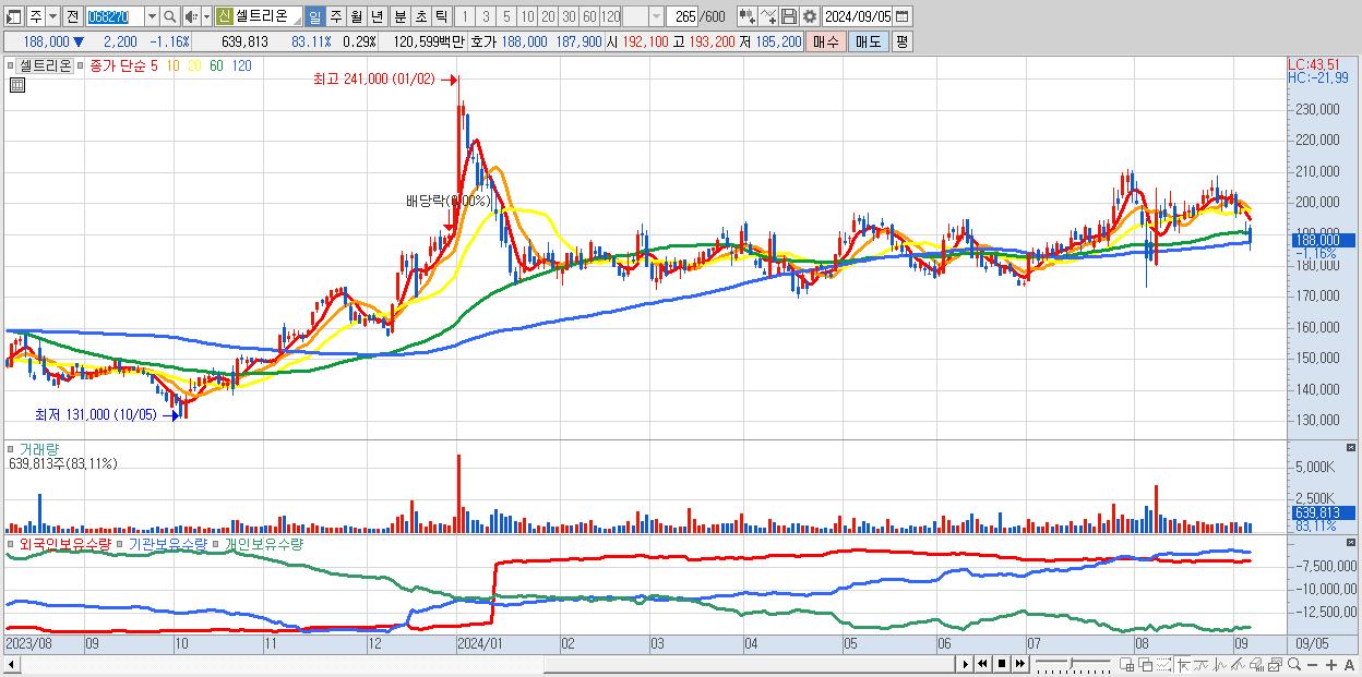 - 셀트리온 (188,000원 ▼ -1.16% , 시총: 408,000억, 거래량: 639,813, 거래대금:1,206억)