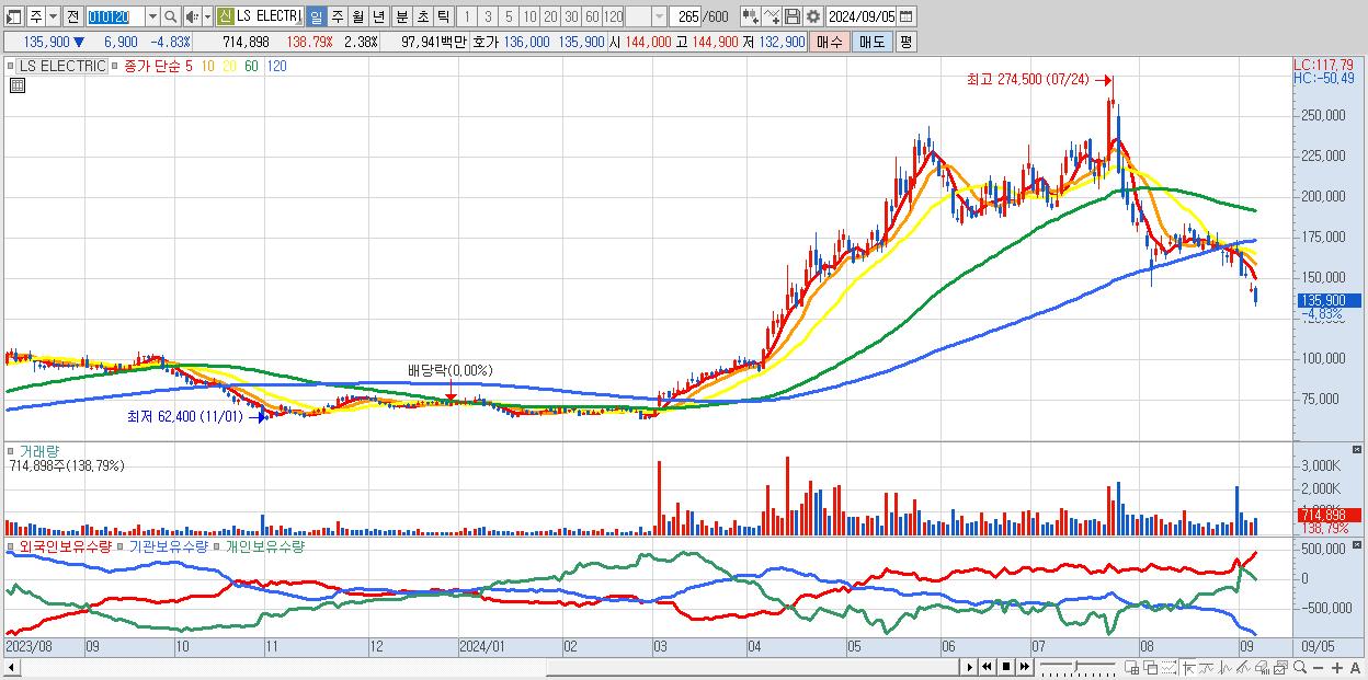 - LS ELECTRIC (135,900원 ▼ -4.83% , 시총: 40,770억, 거래량: 714,898, 거래대금:979억)