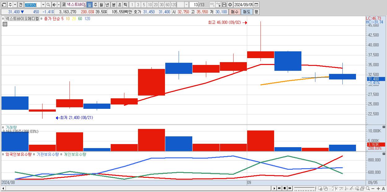 - 넥스트바이오메디컬 (31,400원 ▼ -1.41% , 시총: 2,515억, 거래량: 3,163,270, 거래대금:1,056억)