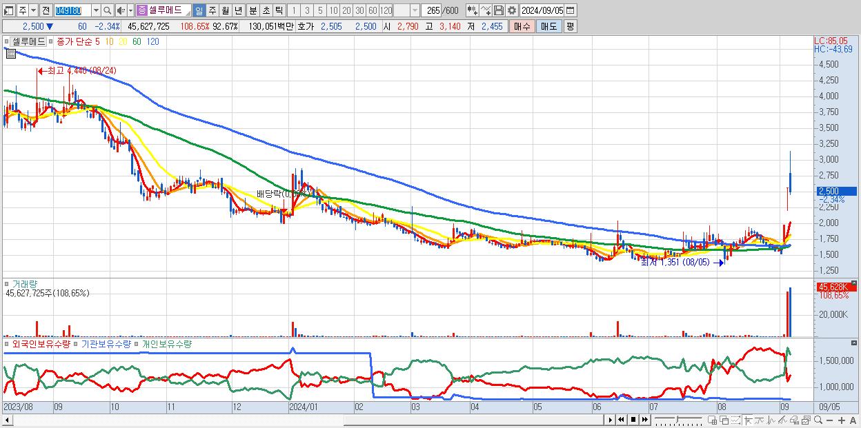- 셀루메드 (2,500원 ▼ -2.34% , 시총: 1,231억, 거래량: 45,627,725, 거래대금:1,301억)