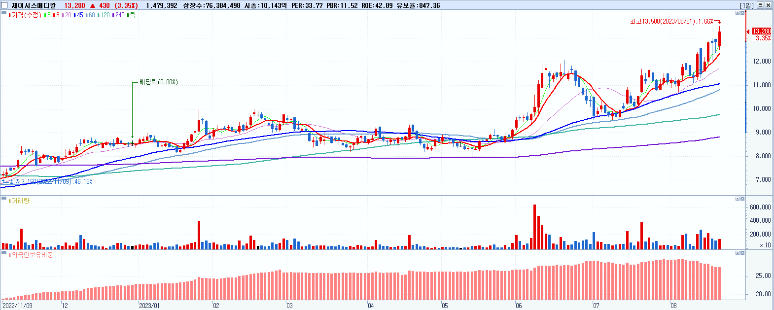 - 제이시스메디칼 (13,280원 ▲ 3.35% , 시총: 10,144억, 거래량: 1,480,250, 거래대금:196억, KOSDAQ)