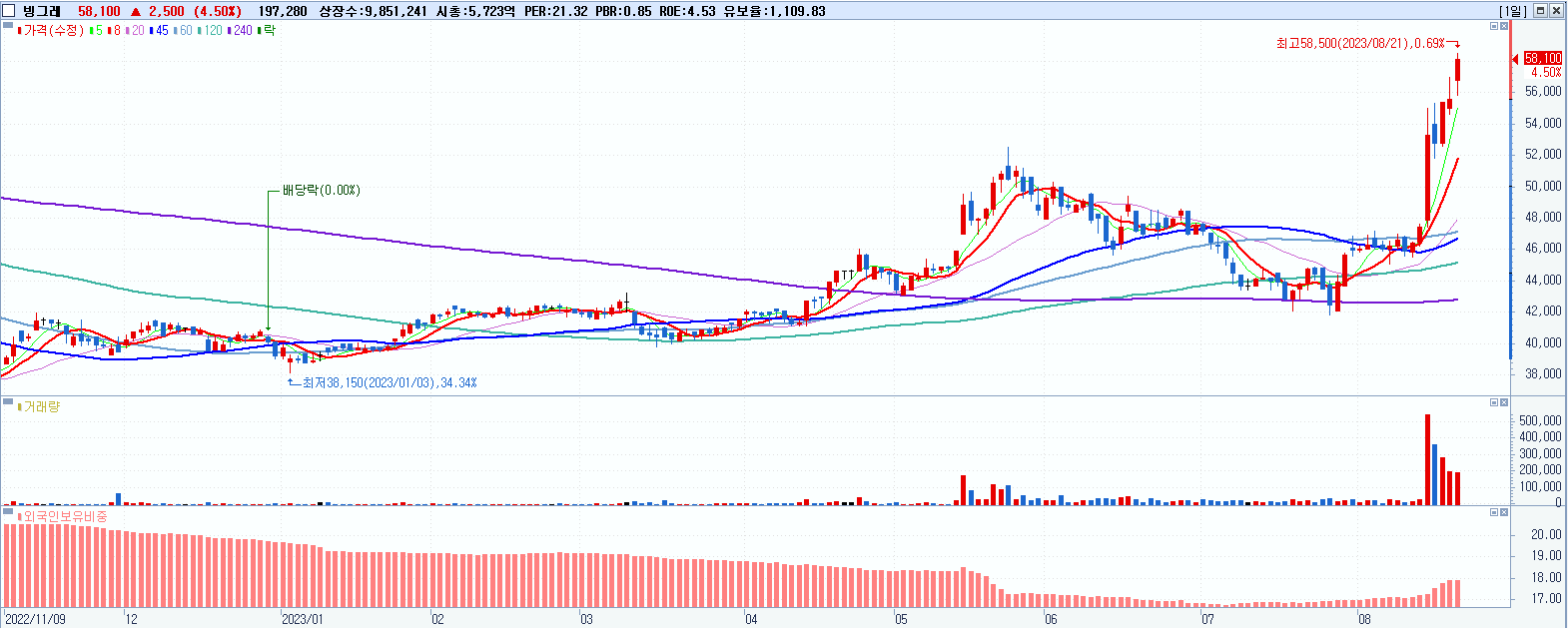 빙그레 58,100원 ▲ 4.5% (KOSPI, 005180)
