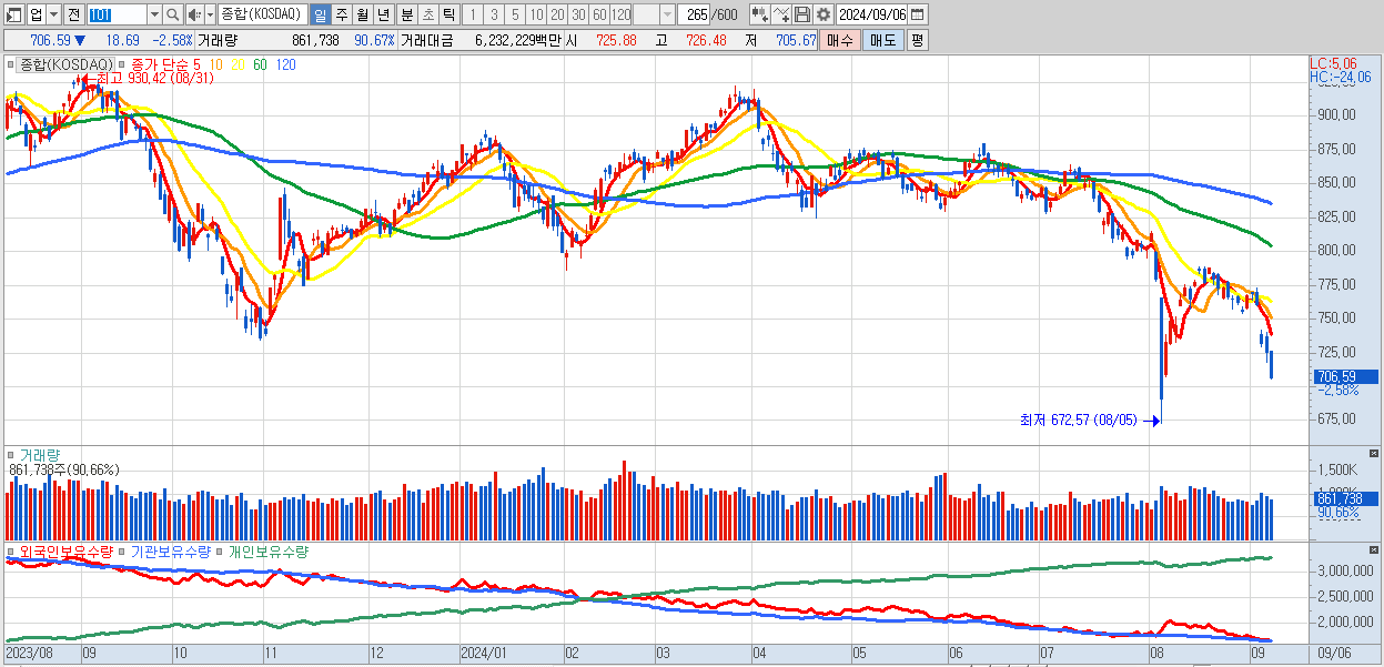 | 09/06 | 706.59 | ▼-2.58% | 815억 | -852억 | -45억 | 81억 |