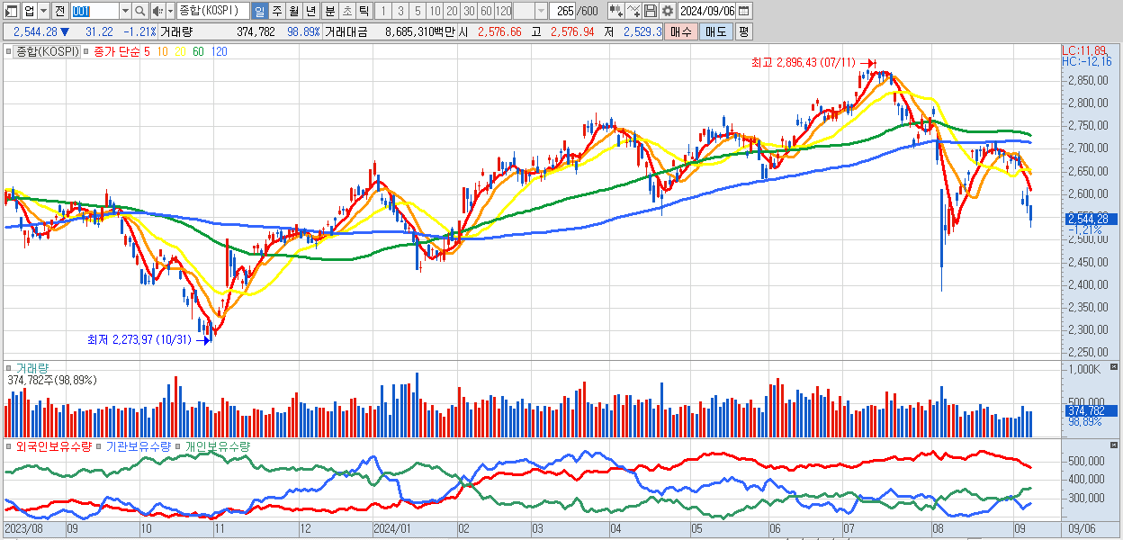 09/06 | 2,544.28 | ▼-1.21% | 1,708억 | -2,649억 | 829억 | 112억 |