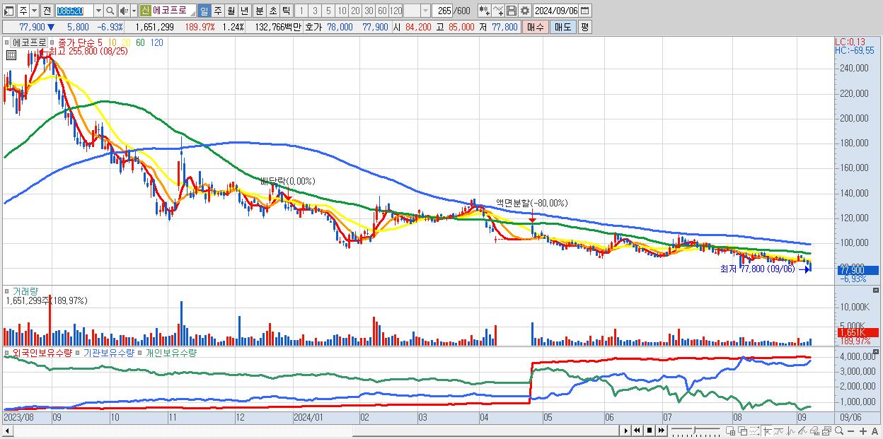 - 에코프로 (77,900원 ▼ -6.93% , 시총: 103,715억, 거래량: 1,651,299, 거래대금:1,328억)