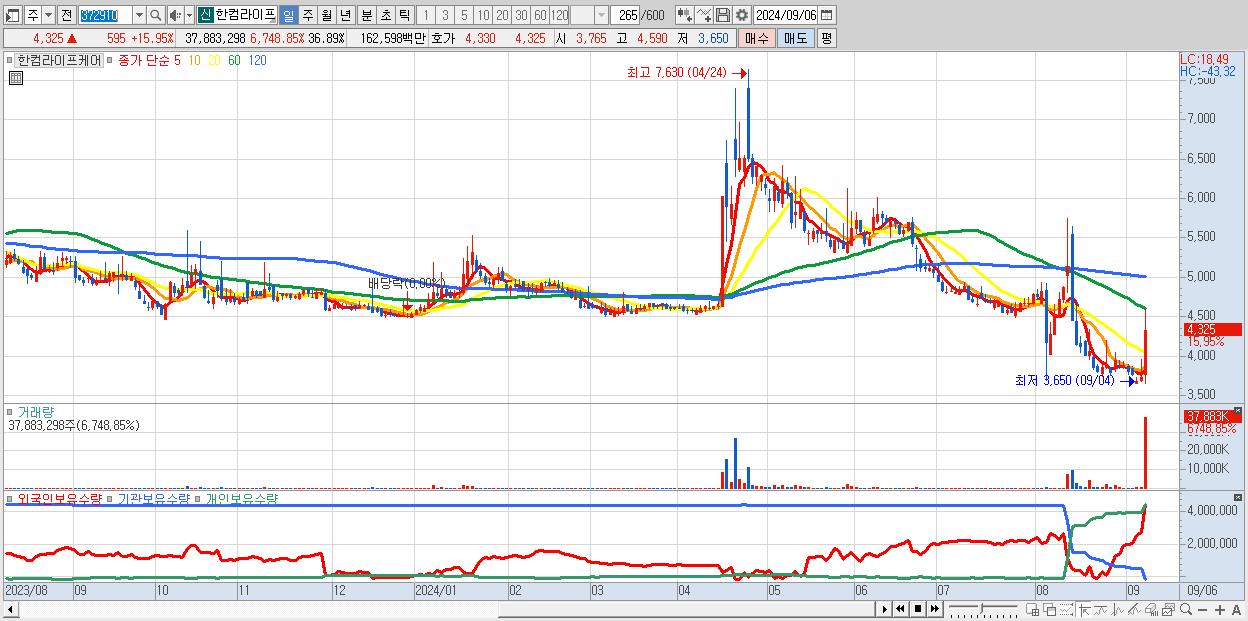 - 한컴라이프케어 (4,325원 ▲ 15.95% , 시총: 1,197억, 거래량: 37,883,298, 거래대금:1,626억)