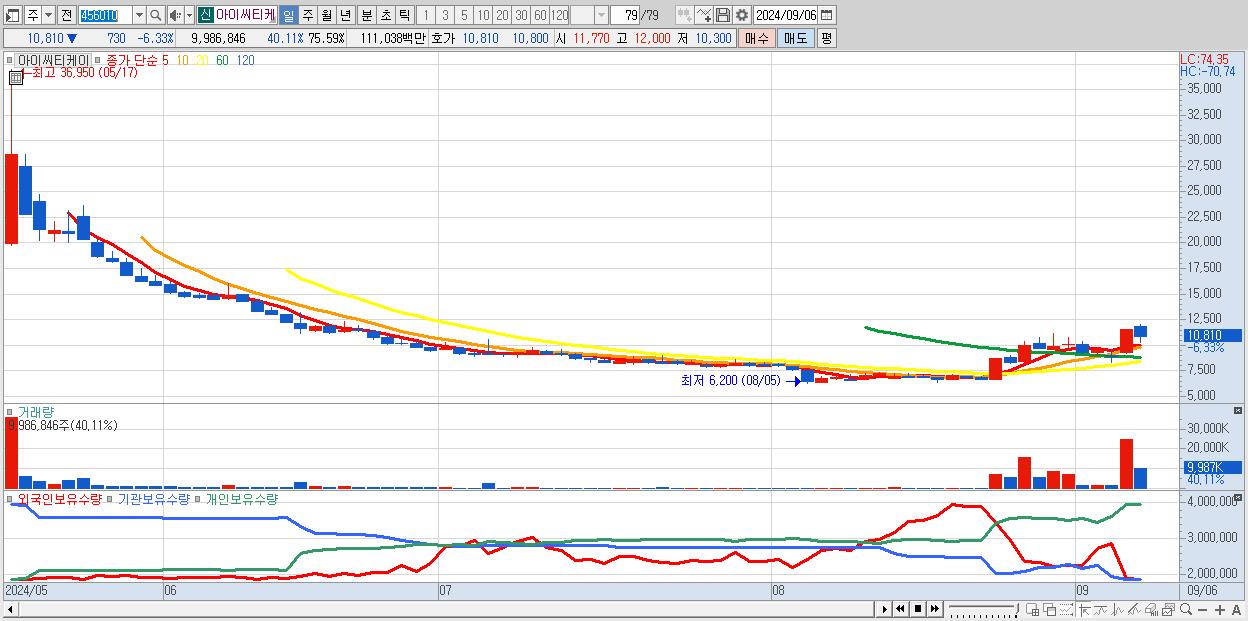 - 아이씨티케이 (10,810원 ▼ -6.33% , 시총: 1,428억, 거래량: 9,986,846, 거래대금:1,110억)