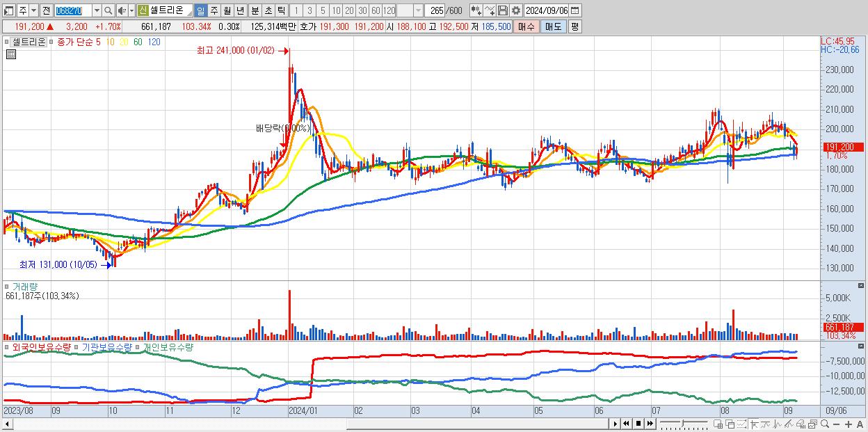 - 셀트리온 (191,200원 ▲ 1.7% , 시총: 414,945억, 거래량: 661,187, 거래대금:1,253억)