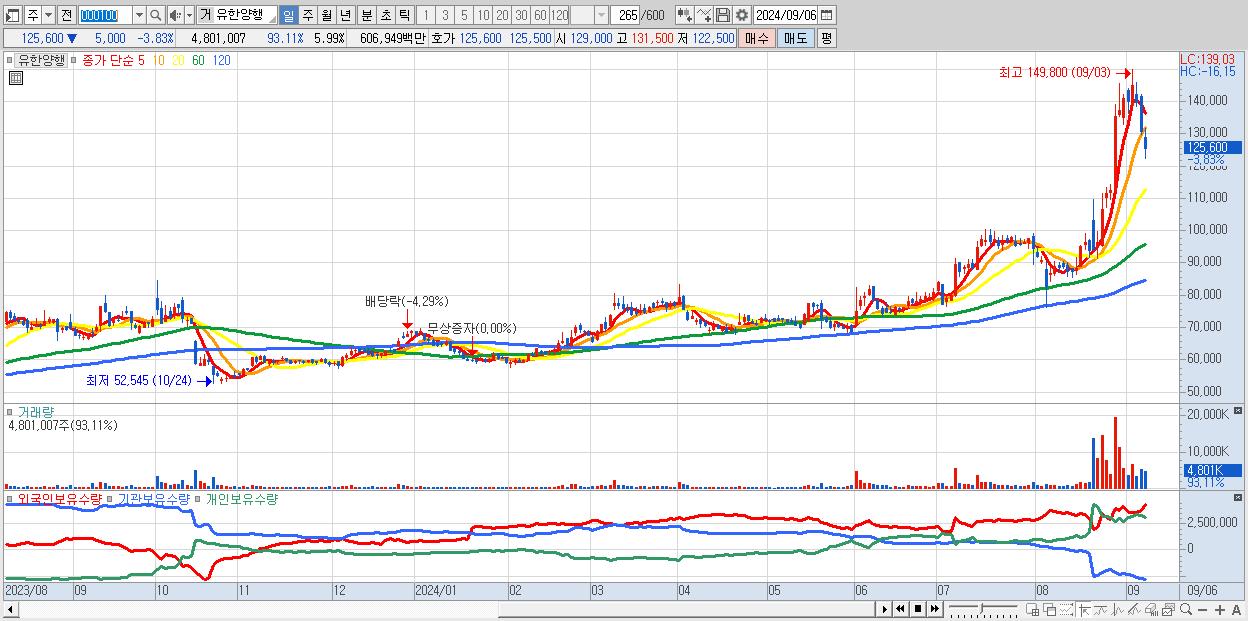 - 유한양행 (125,600원 ▼ -3.83% , 시총: 100,743억, 거래량: 4,801,007, 거래대금:6,069억)