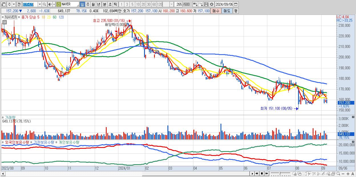 - NAVER (157,200원 ▼ -1.63% , 시총: 252,753억, 거래량: 649,137, 거래대금:1,027억)