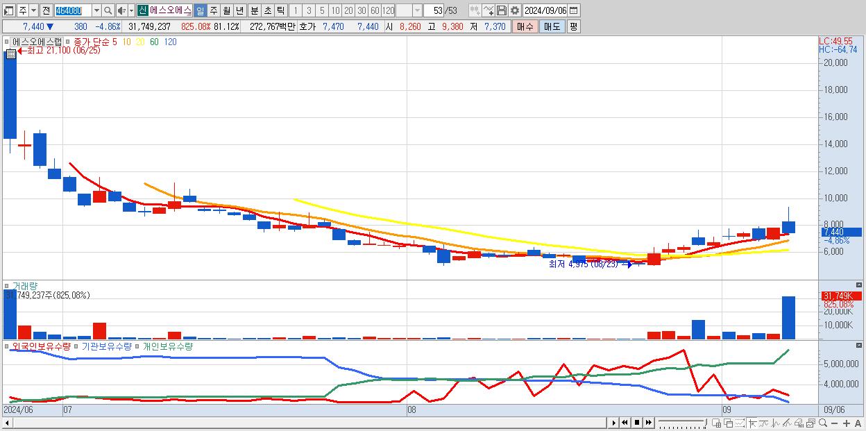 - 에스오에스랩 (7,440원 ▼ -4.86% , 시총: 1,304억, 거래량: 31,749,237, 거래대금:2,728억)