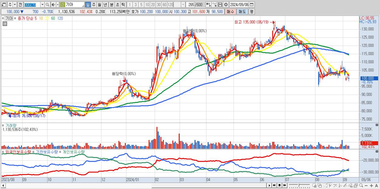 - 기아 (100,000원 ▼ -0.7% , 시총: 399,858억, 거래량: 1,130,536, 거래대금:1,133억)