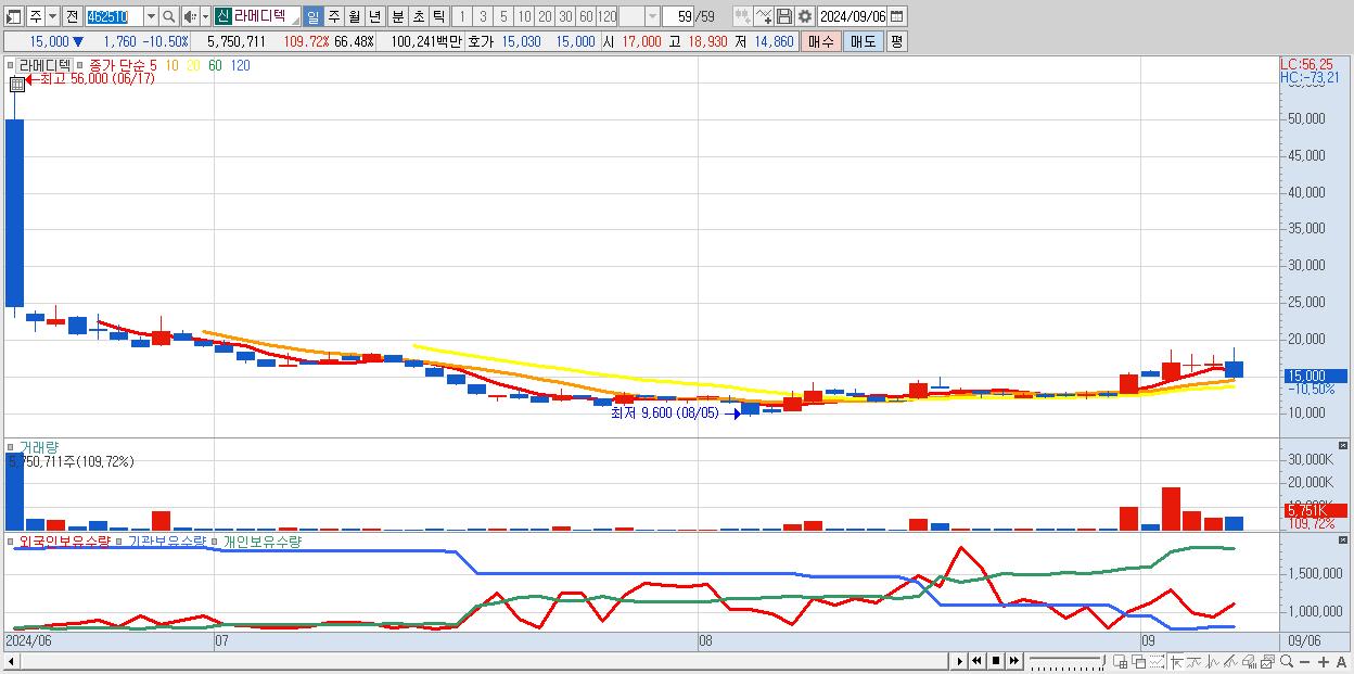 - 라메디텍 (15,000원 ▼ -10.5% , 시총: 1,298억, 거래량: 5,750,711, 거래대금:1,002억)