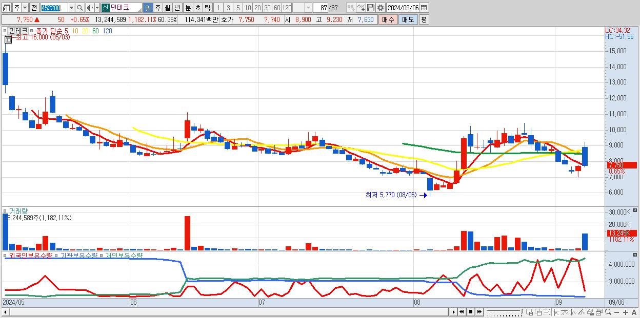 - 민테크 (7,750원 ▲ 0.65% , 시총: 1,701억, 거래량: 13,244,589, 거래대금:1,143억)