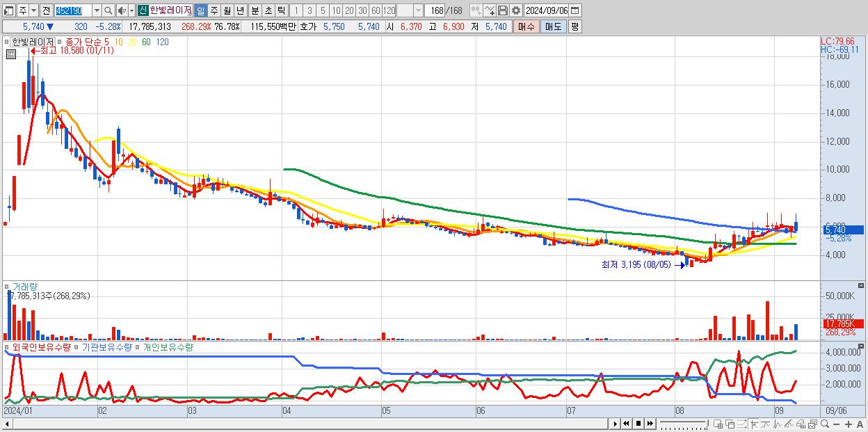 - 한빛레이저 (5,740원 ▼ -5.28% , 시총: 1,330억, 거래량: 17,785,313, 거래대금:1,156억)