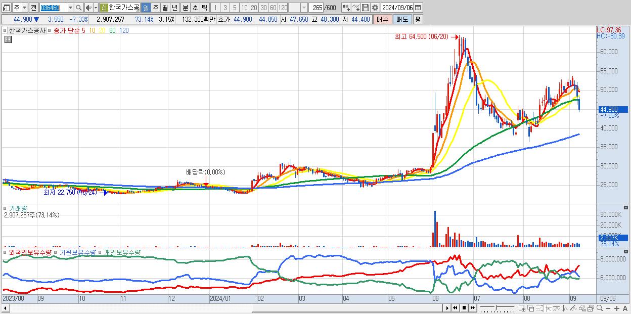 - 한국가스공사 (44,900원 ▼ -7.33% , 시총: 41,449억, 거래량: 2,907,257, 거래대금:1,324억)