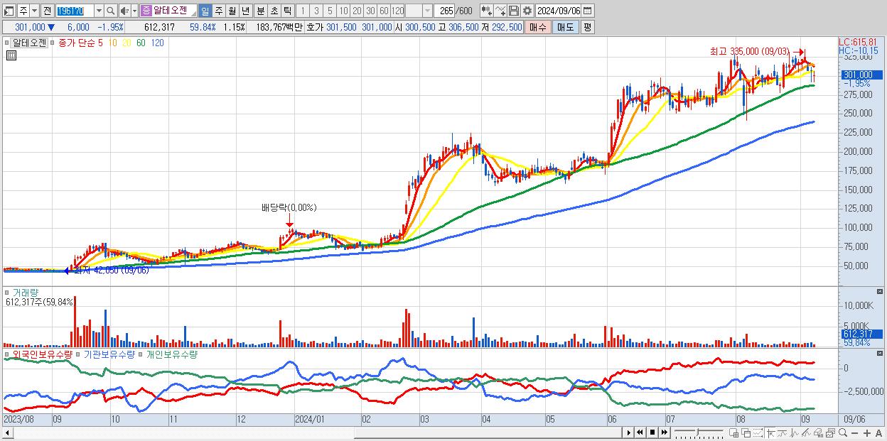 - 알테오젠 (301,000원 ▼ -1.95% , 시총: 159,977억, 거래량: 612,317, 거래대금:1,838억)