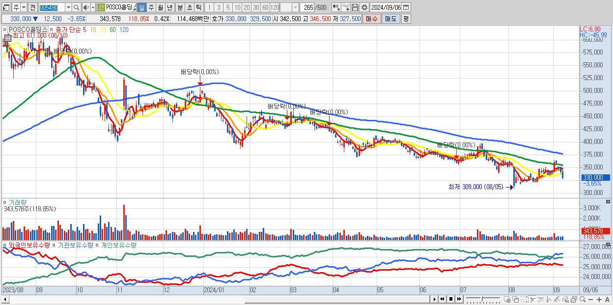 - POSCO홀딩스 (330,000원 ▼ -3.65% , 시총: 272,660억, 거래량: 343,578, 거래대금:1,145억)