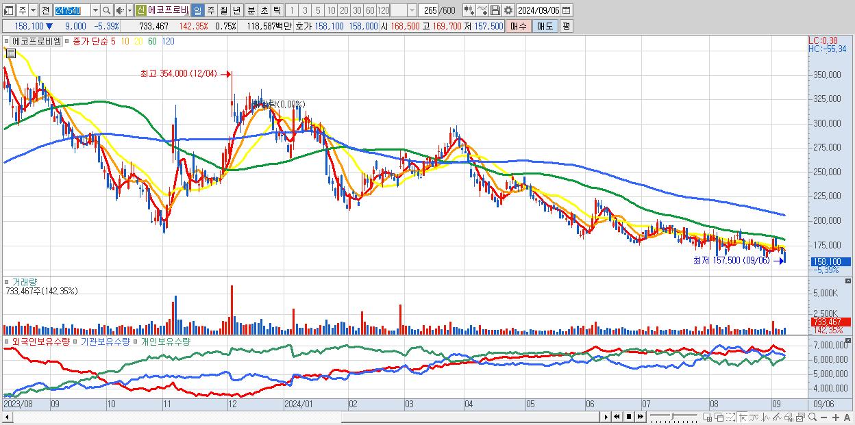 - 에코프로비엠 (158,100원 ▼ -5.39% , 시총: 154,624억, 거래량: 733,467, 거래대금:1,186억)