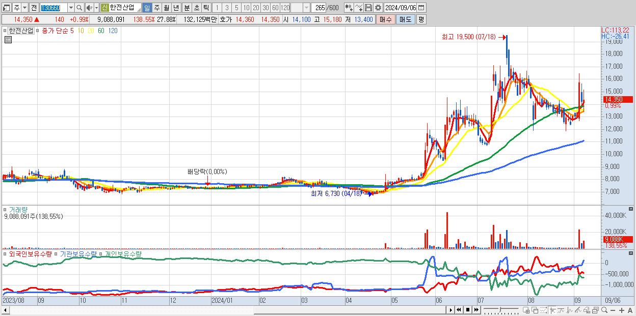 - 한전산업 (14,350원 ▲ 0.99% , 시총: 4,678억, 거래량: 9,088,091, 거래대금:1,321억)