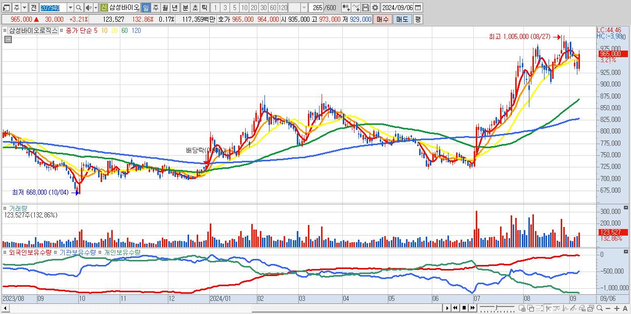 - 삼성바이오로직스 (965,000원 ▲ 3.21% , 시총: 686,829억, 거래량: 123,527, 거래대금:1,174억)