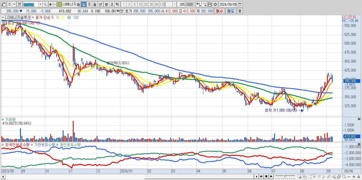 - LG에너지솔루션 (395,000원 ▼ -3.66% , 시총: 924,300억, 거래량: 419,682, 거래대금:1,689억)