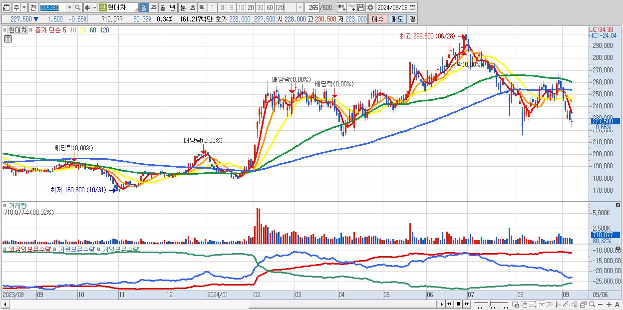 - 현대차 (227,500원 ▼ -0.66% , 시총: 476,422억, 거래량: 710,077, 거래대금:1,612억)