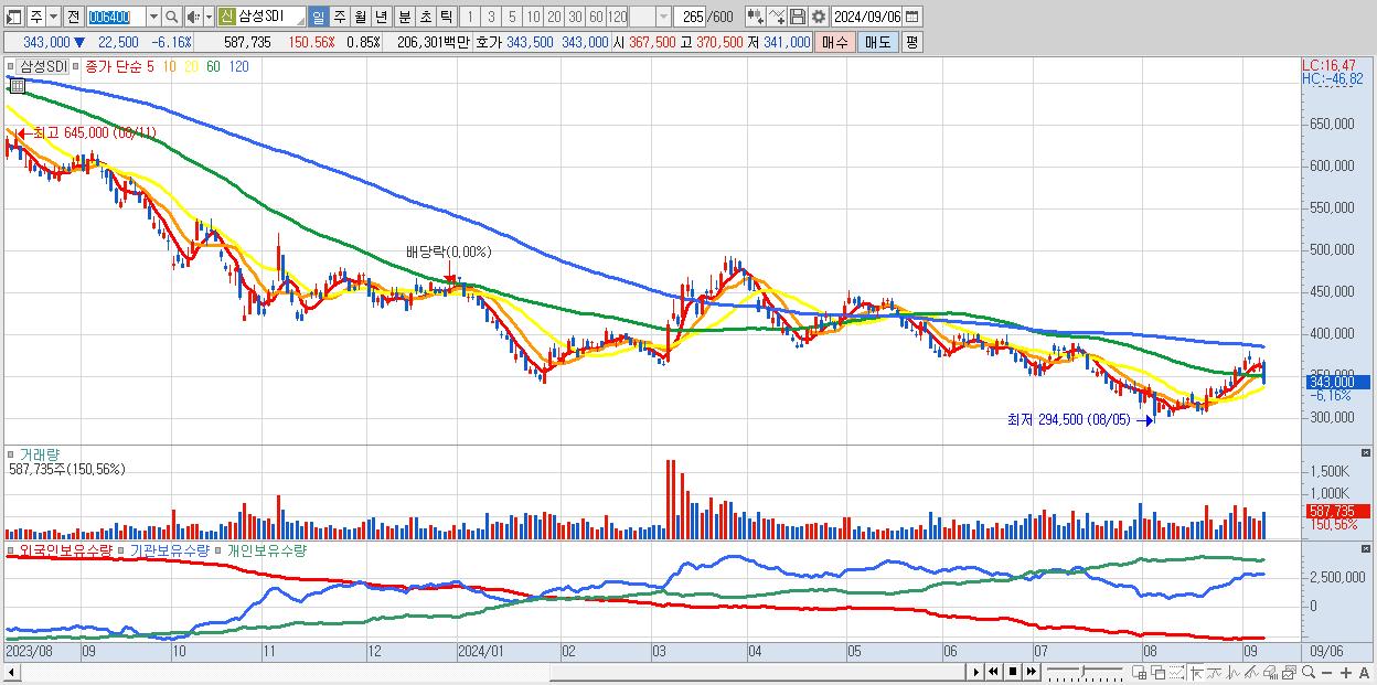 - 삼성SDI (343,000원 ▼ -6.16% , 시총: 235,862억, 거래량: 587,735, 거래대금:2,063억)