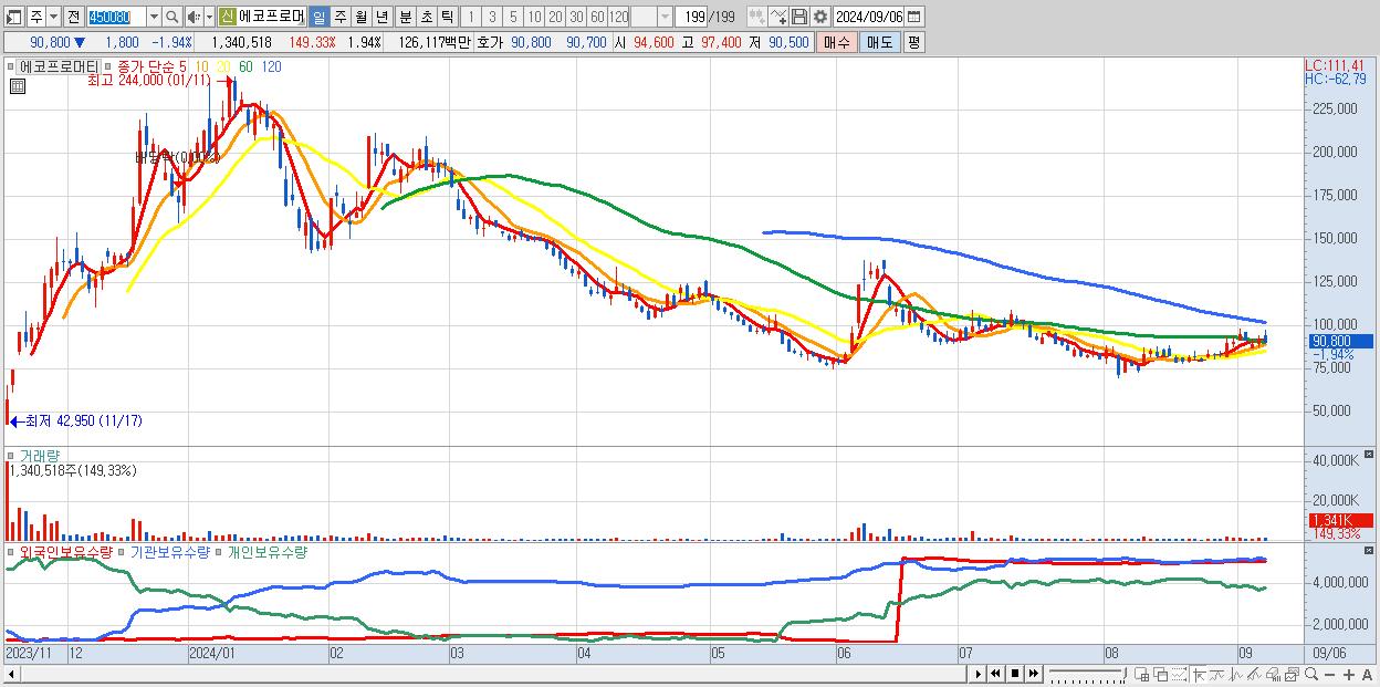- 에코프로머티 (90,800원 ▼ -1.94% , 시총: 62,716억, 거래량: 1,340,518, 거래대금:1,261억)