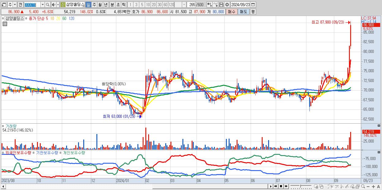 - 삼양홀딩스 (86,900원 ▲ 6.63% , 시총: 7,442억, 거래량: 54,219, 거래대금:47억, KOSPI)