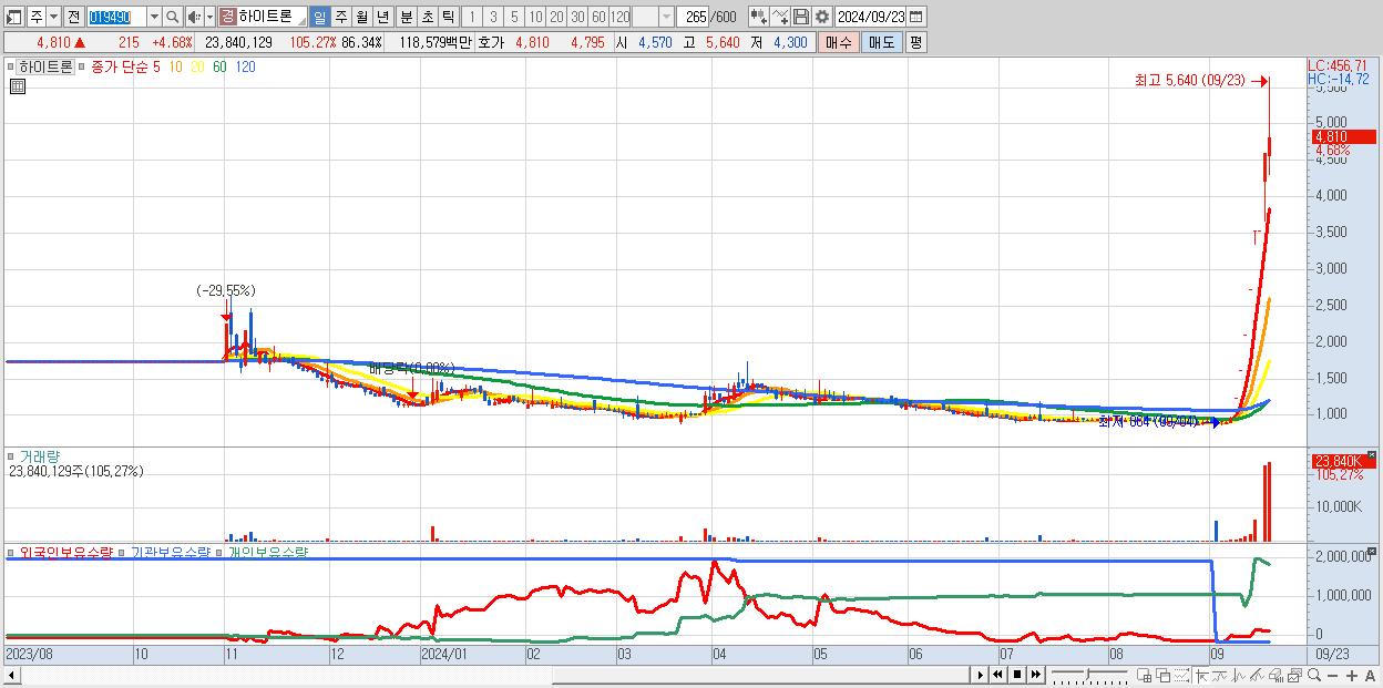 - 하이트론 (4,810원 ▲ 4.68% , 시총: 1,328억, 거래량: 23,840,129, 거래대금:1,186억, KOSPI)