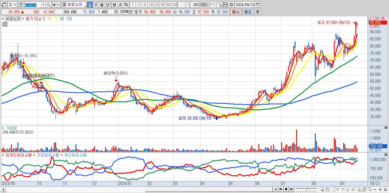 - 보로노이 (96,800원 ▲ 0.94% , 시총: 17,515억, 거래량: 264,496, 거래대금:252억, KOSDAQ)