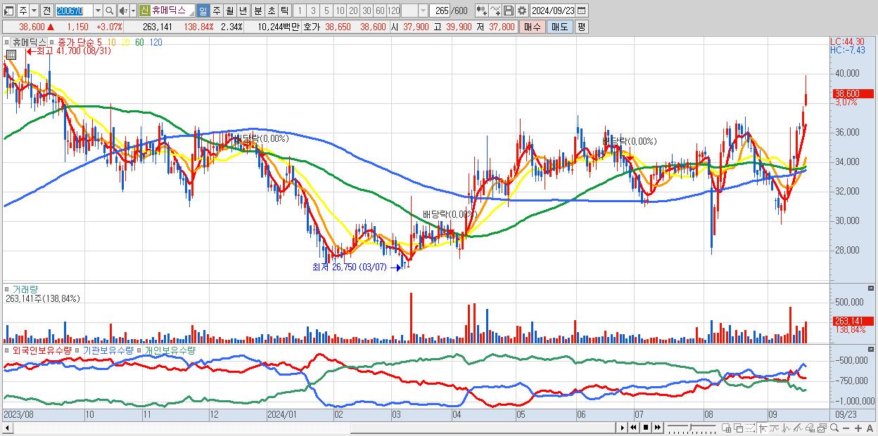 - 휴메딕스 (38,600원 ▲ 3.07% , 시총: 4,335억, 거래량: 263,141, 거래대금:102억, KOSDAQ)