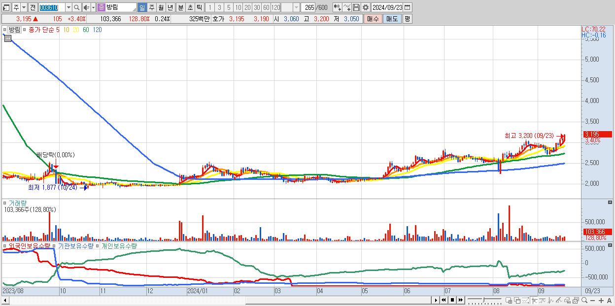 - 방림 (3,195원 ▲ 3.4% , 시총: 1,352억, 거래량: 103,366, 거래대금:3억, KOSPI)