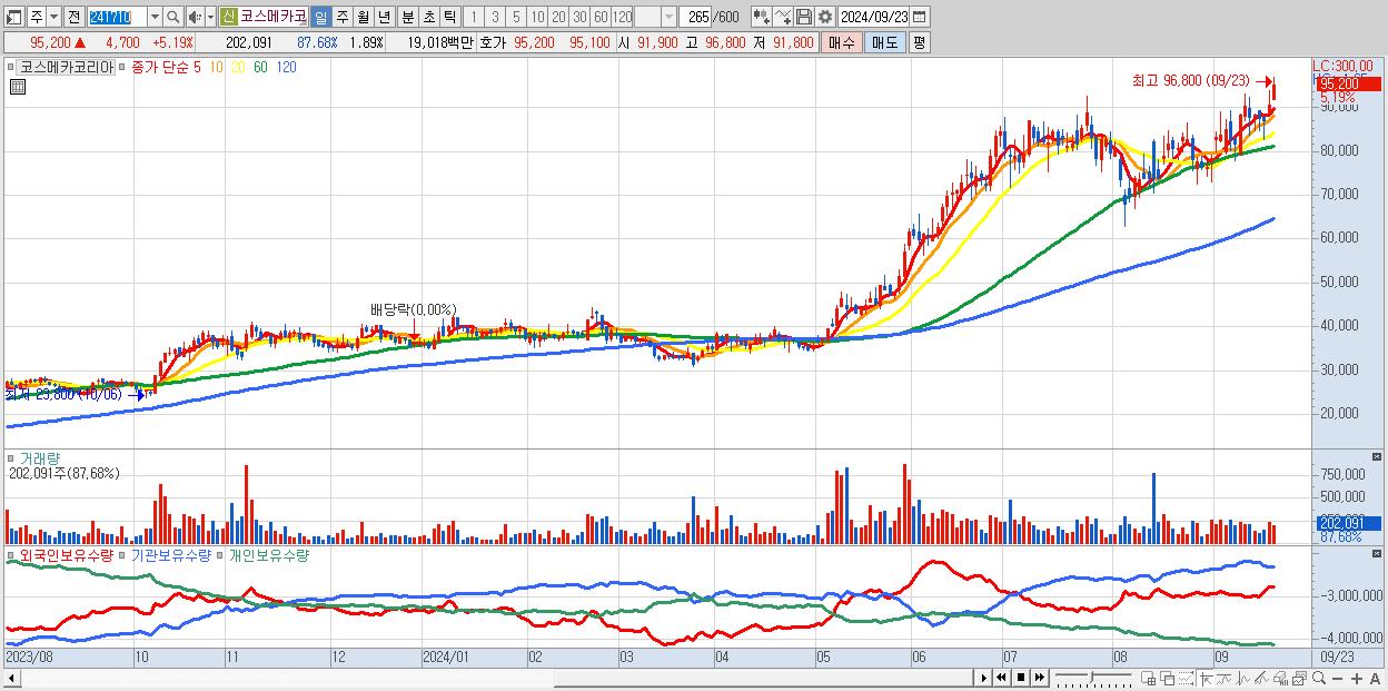 - 코스메카코리아 (95,200원 ▲ 5.19% , 시총: 10,167억, 거래량: 202,091, 거래대금:190억, KOSDAQ)