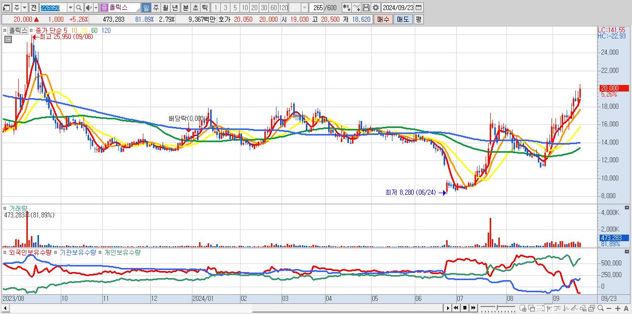 - 올릭스 (20,000원 ▲ 5.26% , 시총: 3,395억, 거래량: 473,283, 거래대금:94억, KOSDAQ)