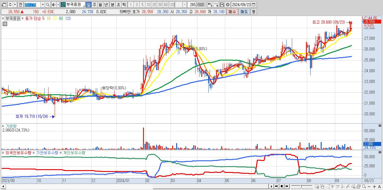 - 부국증권 (28,550원 ▲ 0.53% , 시총: 2,961억, 거래량: 2,080, 거래대금:1억, KOSPI)