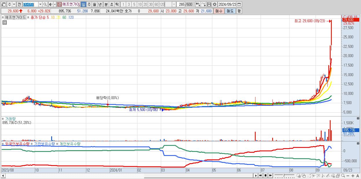 - 에프앤가이드 (29,600원 ▲ 29.82% , 시총: 3,360억, 거래량: 895,736, 거래대금:240억, KOSDAQ)