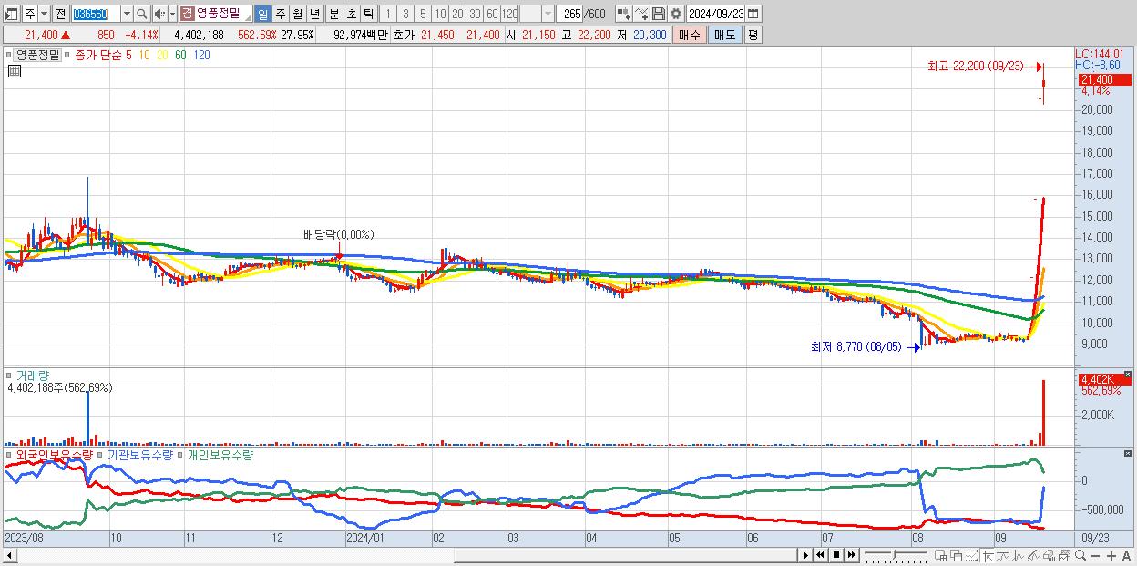 - 영풍정밀 (21,400원 ▲ 4.14% , 시총: 3,371억, 거래량: 4,402,188, 거래대금:930억, KOSDAQ)