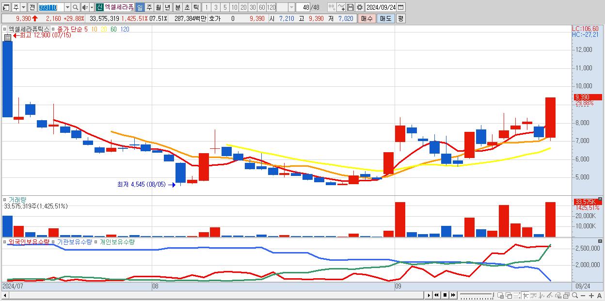 - 엑셀세라퓨틱스 (9,390원 ▲ 29.88% , 시총: 1,025억, 거래량: 33,575,319, 거래대금:2,874억)
