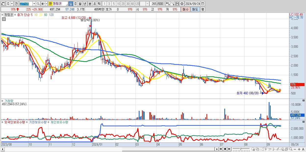 - 퀀텀온 (976원 ▲ 29.96% , 시총: 153억, 거래량: 497,294, 거래대금:5억)
