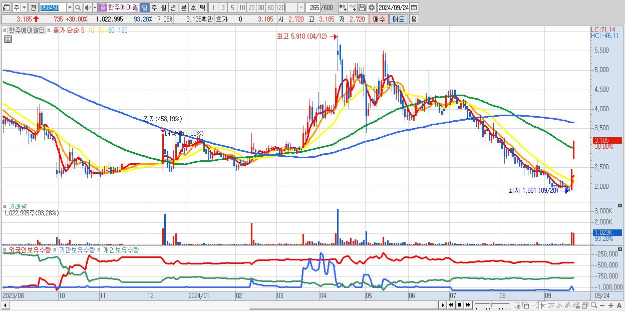- 한주에이알티 (3,185원 ▲ 30% , 시총: 460억, 거래량: 1,022,995, 거래대금:31억)