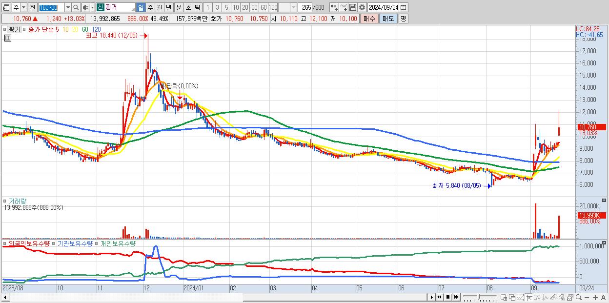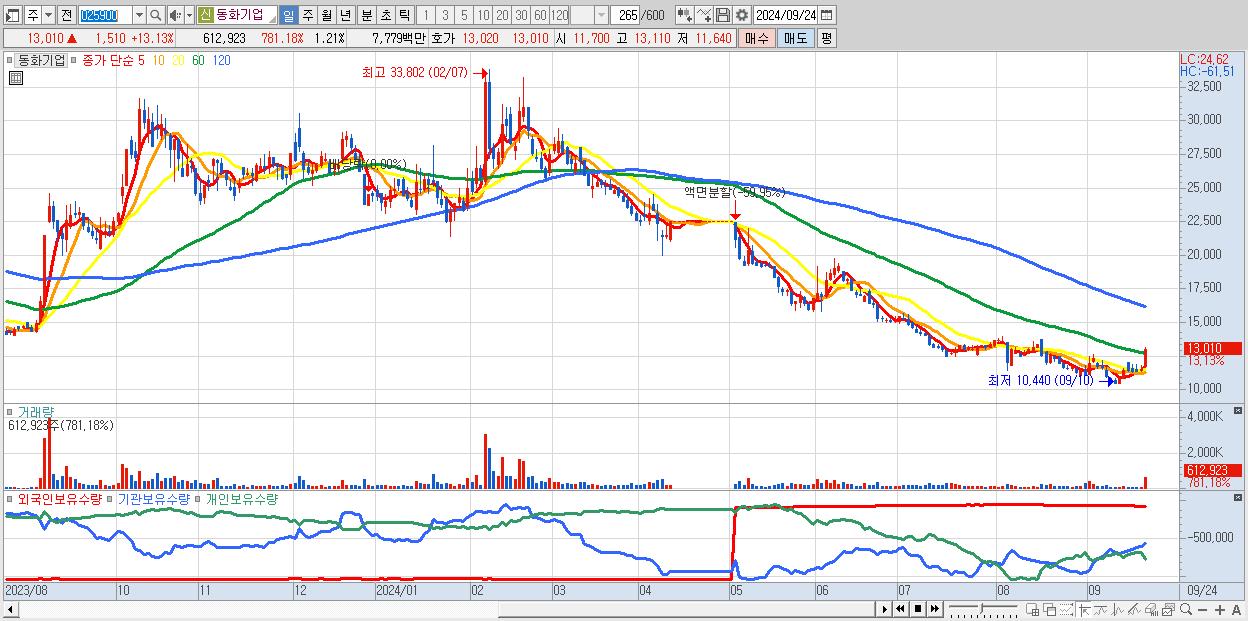 시총: 45,637억 거래량: 2,823,135 거래대금:725억 업종:화학