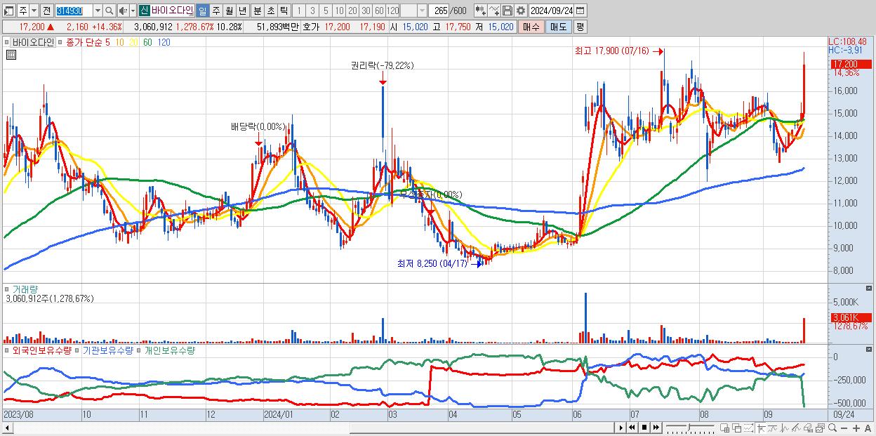 - 바이오다인 (17,200원 ▲ 14.36% , 시총: 5,119억, 거래량: 3,060,912, 거래대금:519억)